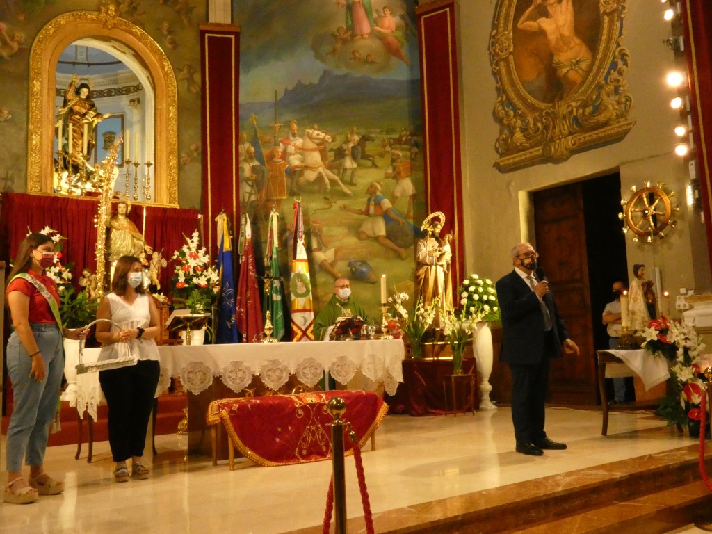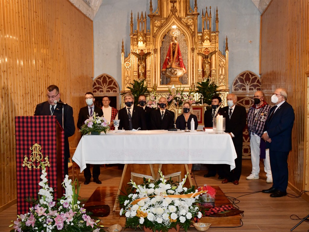 El presidente de los Alagoneses, Simón Díaz, dirigió unas palabras a las personas asistentes sobre este acto de nombramiento de la Virgen del Castillo como Capitana perpetua, recordando que el propósito inicial era llevarlo a cabo con todas las comparsas de Sax en Alagón, dentro de los actos del 55 aniversario del hermanamiento entre ambos pueblos en septiembre de 2020. Pero no pudo ser. Agradeció el trabajo desinteresado de las personas que han colaborado en la elaboración del manto: a José Martínez Antolín por el diseño y el patrón, a Mª Belén López por el bordado, y a Tere Estevan y Susi Chico por la elaboración.