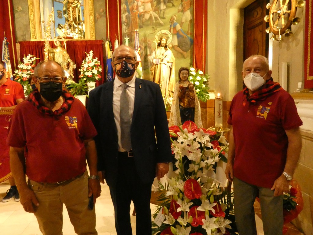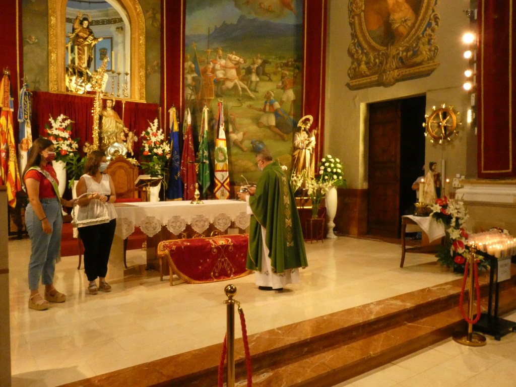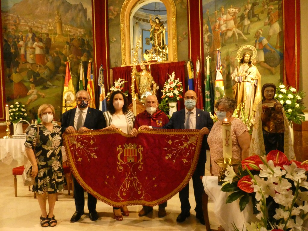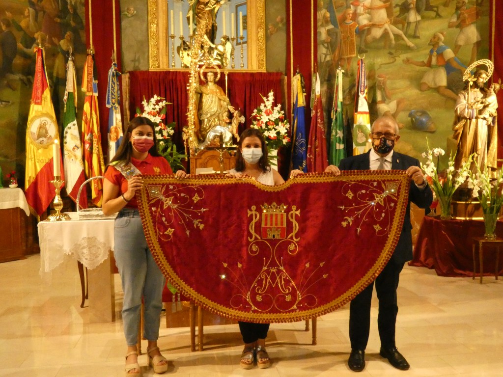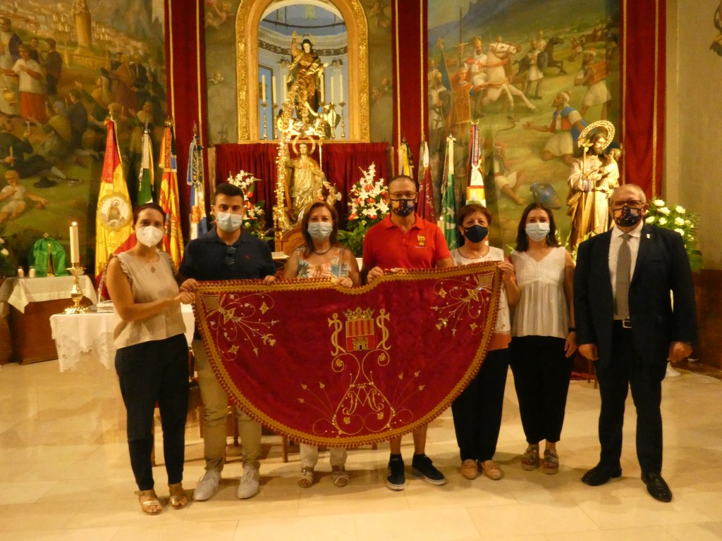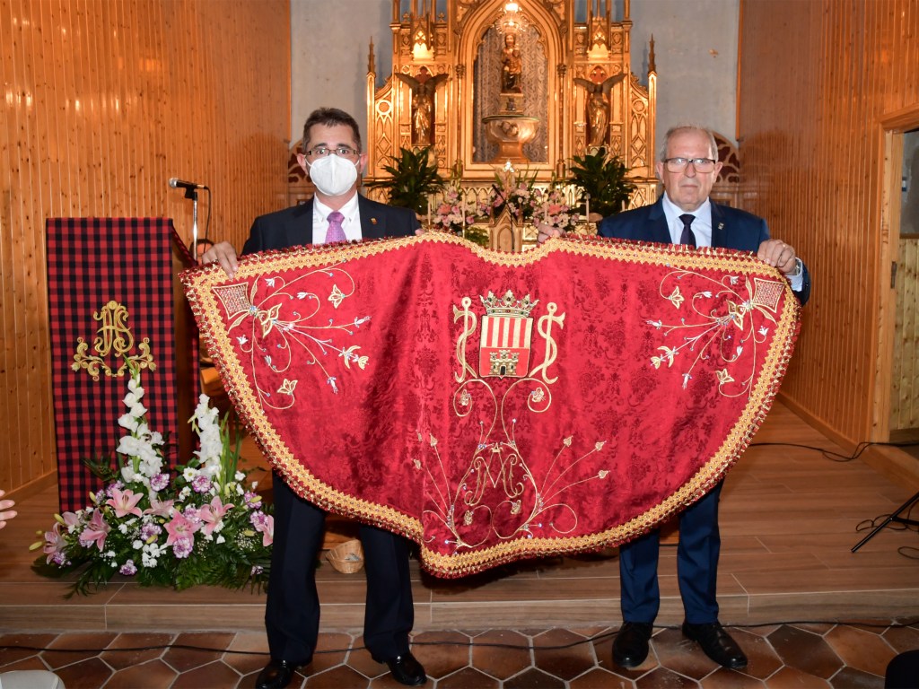 El manto de la Virgen se había bendecido en Sax, el 4 de julio de 2021, durante la misa compartida con la Peña Sajeño Alagonesa. La bendición fue realizada por el cura párroco de Sax, Alfredo Beltrá, junto a las imágenes de San Blas y la de Virgen del Castillo que tenemos en Sax, ambas trasladadas provisionalmente desde la Ermita hasta la iglesia de Ntra. Sra. de la Asunción.