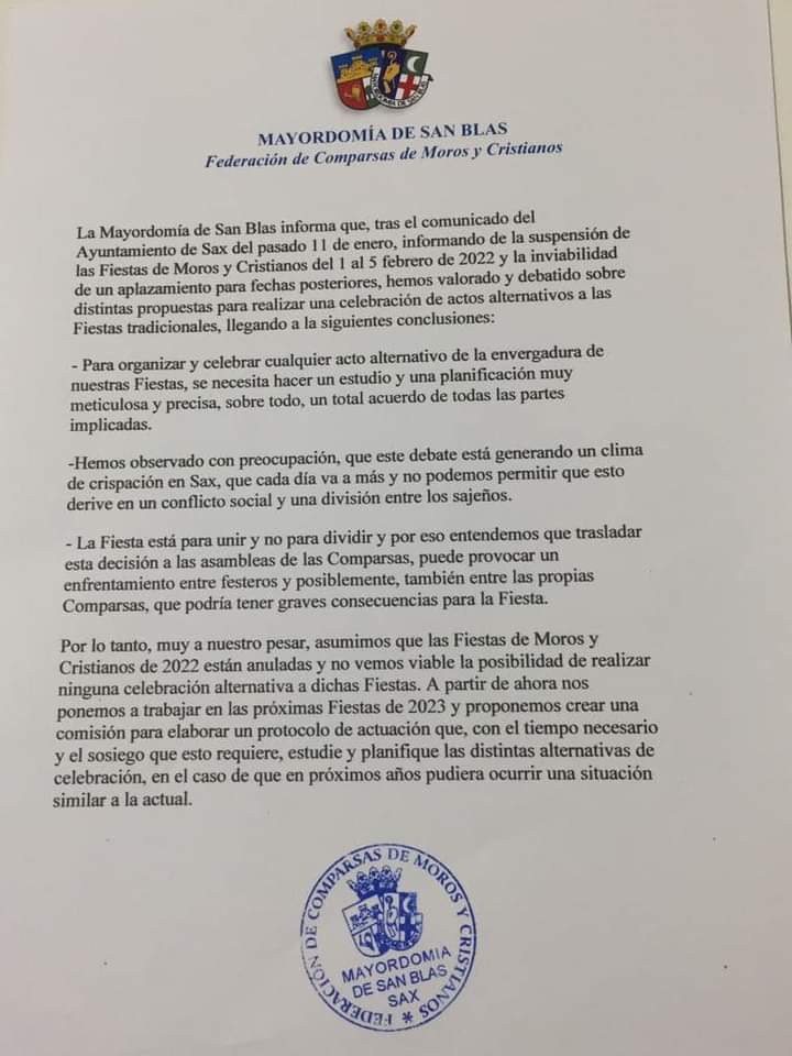La Mayordomía de San Blas comunica que las Fiestas de San Blas 2022 están anuladas y no es viable realizar ninguna celebración alternativa.